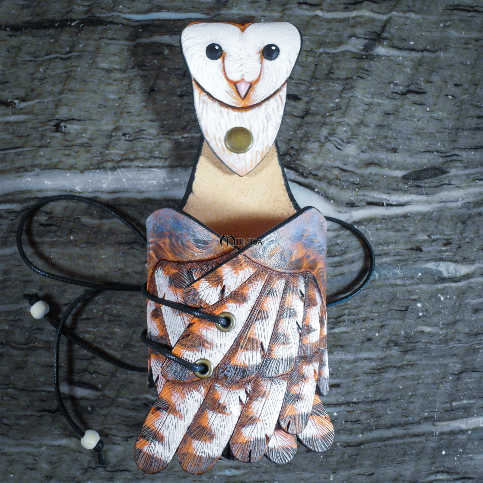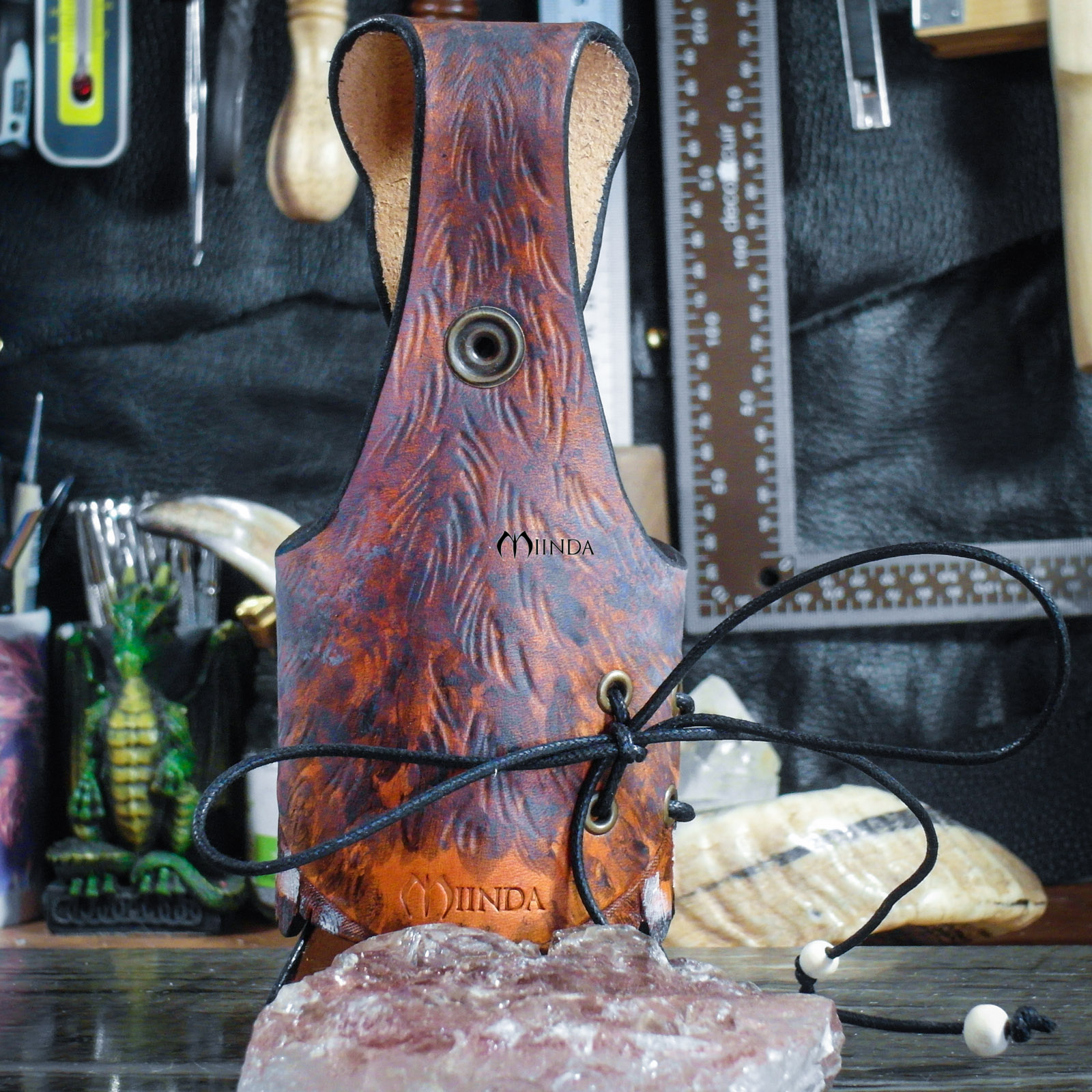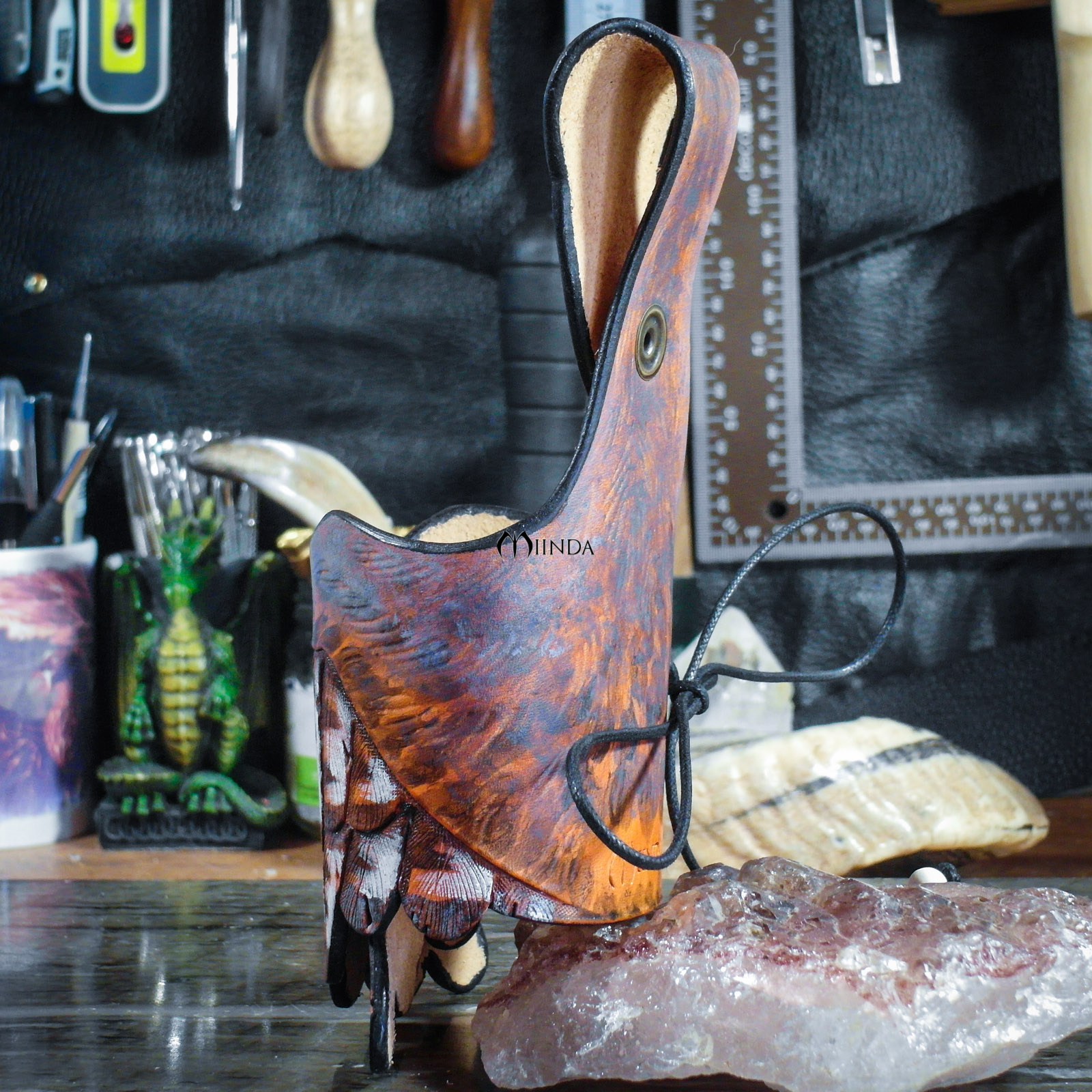 Réalisé en cuir de bovin tannage végétal, épaisseur 2.5 mm, repoussé et teinté main.
